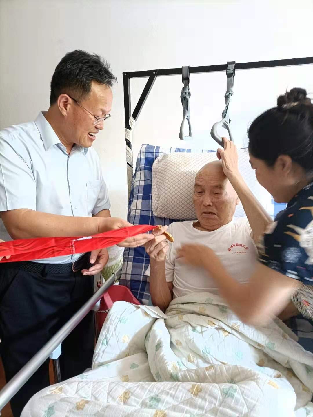 在老黨員付書紹的家中,王洪濤書記親切詢問他的身體和生活情況,俯身傾聽交流。付書紹是參加過抗美援朝的老兵,年近90歲高齡,當(dāng)王洪濤書記把紀(jì)念章掛到他胸前時(shí),老人熱淚盈眶,握著王洪濤書記的手,久久不愿松開。