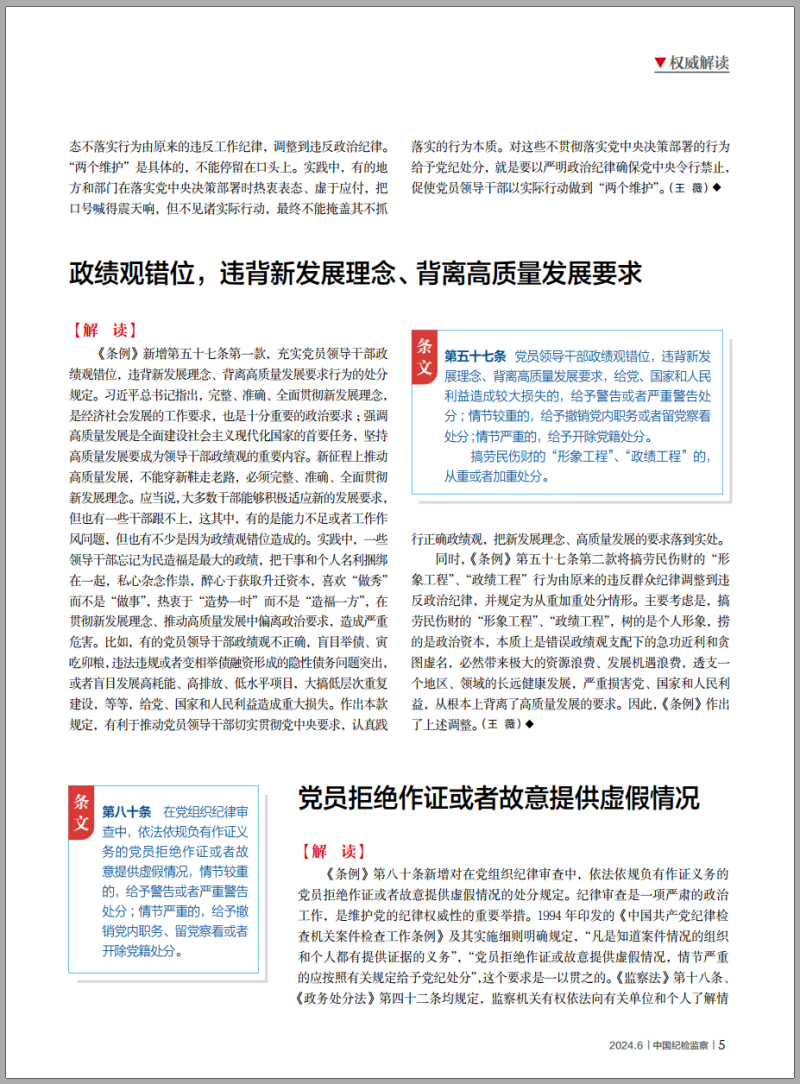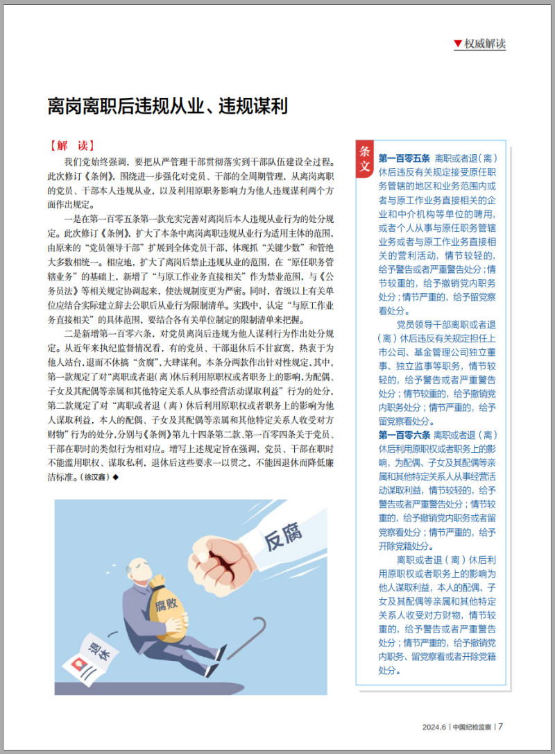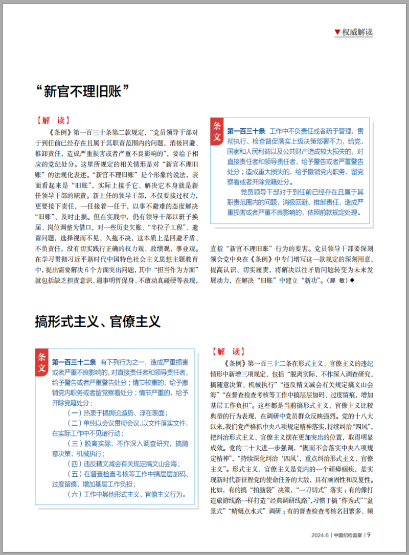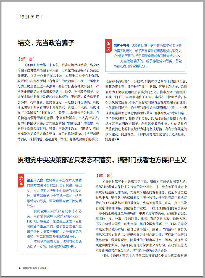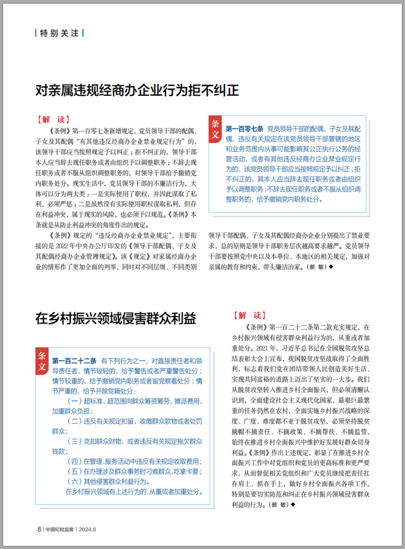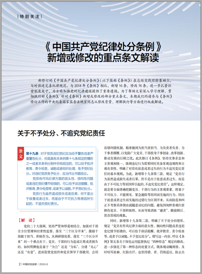 新修訂的《中國(guó)共產(chǎn)黨紀(jì)律處分條例》(以下簡(jiǎn)稱《條例》)在總結(jié)實(shí)踐經(jīng)驗(yàn)基礎(chǔ)上,與時(shí)俱進(jìn)完善紀(jì)律規(guī)范,與 2018 年《條例》相比,新增 16 條,修改 76 條,進(jìn)一步扎緊織密制度籠子,為全面加強(qiáng)黨的紀(jì)律建設(shè)提供了重要遵循。為了幫助大家深入學(xué)習(xí)理解、貫徹執(zhí)行好《條例》,針對(duì)《條例》新增或修改的部分重點(diǎn)條文,本期我們約請(qǐng)參與《條例》修訂工作的中央紀(jì)委國(guó)家監(jiān)委法規(guī)室同志從修改背景、理解執(zhí)行等方面進(jìn)行權(quán)威解讀。