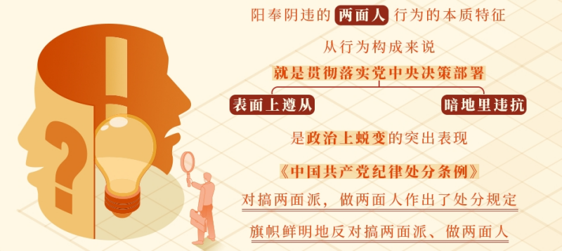 陽奉陰違的兩面人行為的本質(zhì)特征,從行為構(gòu)成來說,就是貫徹落實(shí)黨中央決策部署表面上遵從,暗地里違抗,是政治上蛻變的突出表現(xiàn)。