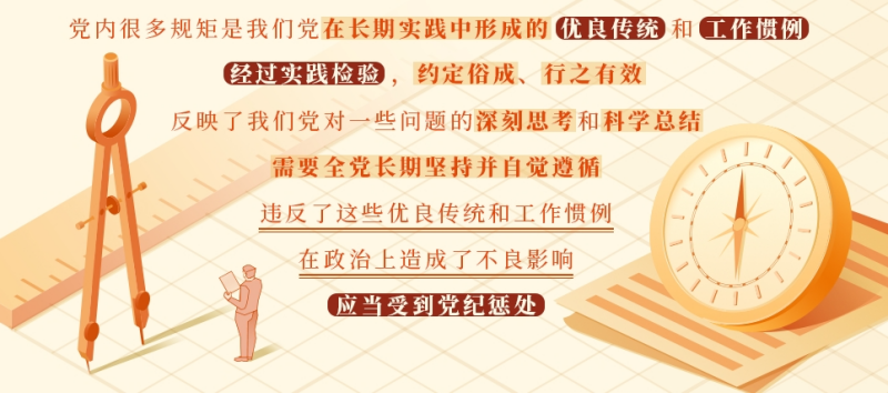 黨內(nèi)很多規(guī)矩是我們黨在長期實踐中形成的優(yōu)良傳統(tǒng)和工作慣例,經(jīng)過實踐檢驗,約定俗成、行之有效,反映了我們黨對一些問題的深刻思考和科學(xué)總結(jié),需要全黨長期堅持并自覺遵循。這些規(guī)矩看著沒有白紙黑字的規(guī)定,但都是一種傳統(tǒng)、一種范式、一種要求。違反了這些優(yōu)良傳統(tǒng)和工作慣例,在政治上造成了不良影響,應(yīng)當(dāng)受到黨紀(jì)懲處。