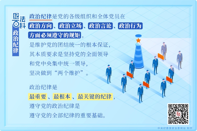 黨的紀律是多方面的,但政治紀律是最重要、最根本、最關鍵的紀律,遵守黨的政治紀律是遵守黨的全部紀律的重要基礎。