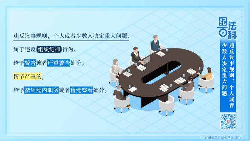 《中國共產(chǎn)黨紀(jì)律處分條例》第七十七條規(guī)定了違反民主集中制原則的四種情形,其中之一就是違反議事規(guī)則,個(gè)人或者少數(shù)人決定重大問題。《條例》規(guī)定,對(duì)該違紀(jì)行為,給予警告或者嚴(yán)重警告處分;情節(jié)嚴(yán)重的,給予撤銷黨內(nèi)職務(wù)或者留黨察看處分。