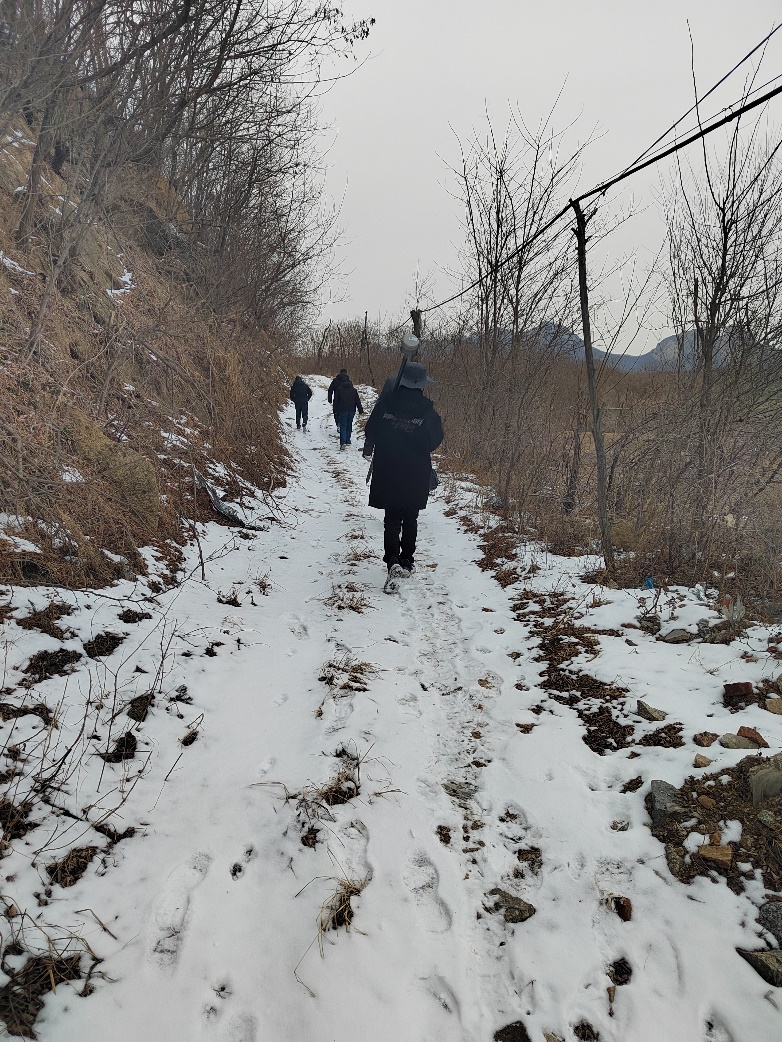 本次塘壩排查工作時(shí)間緊、任務(wù)重,排查期間多次遭遇風(fēng)雪惡劣天氣,且多數(shù)塘壩都是20世紀(jì)60至70年代所建,防汛道路均為狹窄土路,交通極為不便。安全隱患排查的一周時(shí)間里,項(xiàng)目組成員穿著厚厚的羽絨服,日行兩萬(wàn)余步,翻山越嶺,迎風(fēng)雪,戰(zhàn)泥濘,穿叢林荊棘。每日高強(qiáng)度徒步在田野山地間,白天在溢洪道里、堤頂和堤腳上定位、測(cè)量高程、拍照,晚上組長(zhǎng)整理當(dāng)天記錄的信息和問(wèn)題,組員整理航拍影像,勘測(cè)同事整理位置信息并將點(diǎn)位按照排查順序點(diǎn)在奧維地圖上,涉及的內(nèi)容繁多,每個(gè)組都是白天忙外業(yè),晚上忙內(nèi)業(yè)。排查期間,郭曉鎮(zhèn)感冒生病,李子民走山路摔傷了膝蓋,趙連濤去壩腳測(cè)量定位時(shí)被異物扎傷了腳踝,第二小組在前往塘壩途中乘坐村內(nèi)的電動(dòng)三輪車發(fā)生了側(cè)翻……天氣寒冷、雪花飄灑,山地里的雪亦未消融,回想起在泥濘的鄉(xiāng)村路上我們乘車前往塘壩現(xiàn)場(chǎng)時(shí),途中盤山彎路很多,每次快要抵達(dá)目的地時(shí),車載導(dǎo)航都會(huì)提醒:“今日走過(guò)了所有的彎路,從此人生盡是坦途!”每當(dāng)聽到這句話都讓我們精神振奮,是啊,人生道路上總會(huì)遇到彎路,可是再長(zhǎng)的彎路,也總會(huì)有平坦的時(shí)候,路就在前方!