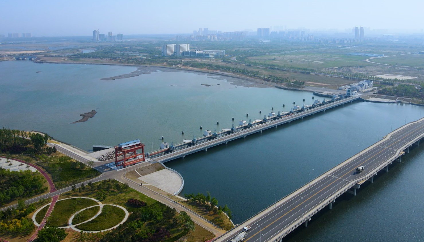 4.威海市南海新區(qū)香水河擋潮閘工程大跨度雙拱曲面鋼閘門,為國(guó)內(nèi)首次采用的、最大跨度的直升式拱形閘門;同時(shí)作為水利部“露頂式大跨度雙曲拱閘門新技術(shù)推廣應(yīng)用”項(xiàng)目進(jìn)行技術(shù)示范(項(xiàng)目編號(hào)SF-201728)。水利部水工金屬結(jié)構(gòu)質(zhì)量檢驗(yàn)測(cè)試中心進(jìn)行了幾何尺寸檢測(cè)和應(yīng)力、應(yīng)變?cè)陀^測(cè),結(jié)果表明該閘門制作質(zhì)量合格,閘門結(jié)構(gòu)安全可靠,應(yīng)力和應(yīng)變符合性良好。