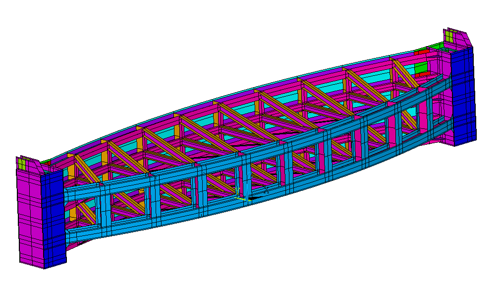 3.利用空間有限元分析方法,首次深入研究了大跨度雙拱板桁曲面閘門及雙拱管桁曲面閘門的應(yīng)力、變形、自由振動(dòng)和整體穩(wěn)定特點(diǎn),其成果為該類閘門的結(jié)構(gòu)設(shè)計(jì)和應(yīng)用提供了理論基礎(chǔ)。結(jié)果表明,雙拱曲面結(jié)構(gòu)使得閘門跨中應(yīng)力峰值有效減小,應(yīng)力分布均勻;閘門剛度增大,各工況荷載作用下的結(jié)構(gòu)變形減?。唤Y(jié)構(gòu)應(yīng)力和剛度沒有明顯較弱部位;在大、中跨度方面顯示出較大的優(yōu)勢(shì),節(jié)省閘門用鋼量。