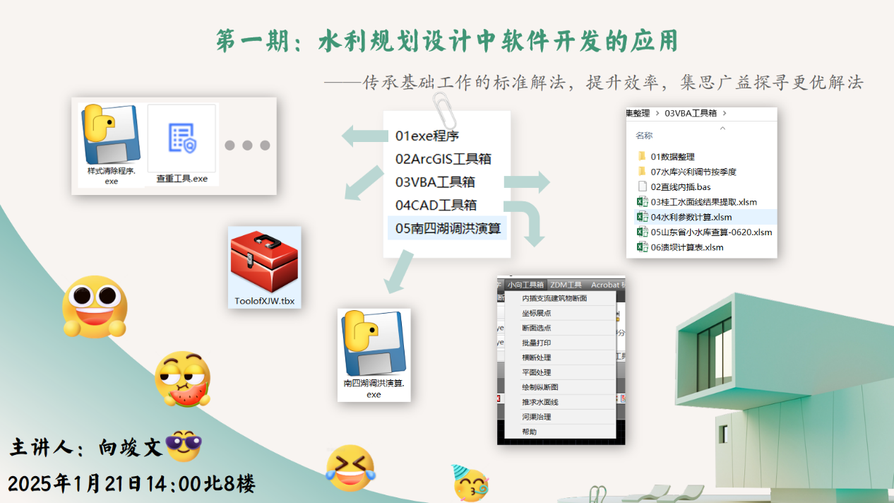 此次交流會內(nèi)容分為兩個部分:一是《時代浪潮中的設(shè)計院——青年設(shè)計師的使命與展望》,提出2035年基本實現(xiàn)AI設(shè)計、2050年全面實現(xiàn)智慧設(shè)計的暢想。鼓勵青年設(shè)計師認(rèn)清水利設(shè)計行業(yè)發(fā)展趨勢,抓住AI+水利風(fēng)口,實現(xiàn)個人發(fā)展。二是《水利規(guī)劃設(shè)計中軟件開發(fā)的應(yīng)用——高效與創(chuàng)新》,針對規(guī)范查重、編制報告中Word文檔格式的規(guī)范統(tǒng)一、ArcGIS提取斷面數(shù)據(jù)、優(yōu)化河道治理過程中的水面線計算、橫縱斷面繪制等問題,分享16項自研程序;針對工程量計算、制圖、編寫報告等基礎(chǔ)工作,提出了匯編標(biāo)準(zhǔn)解法的倡議,提升工作效率。
